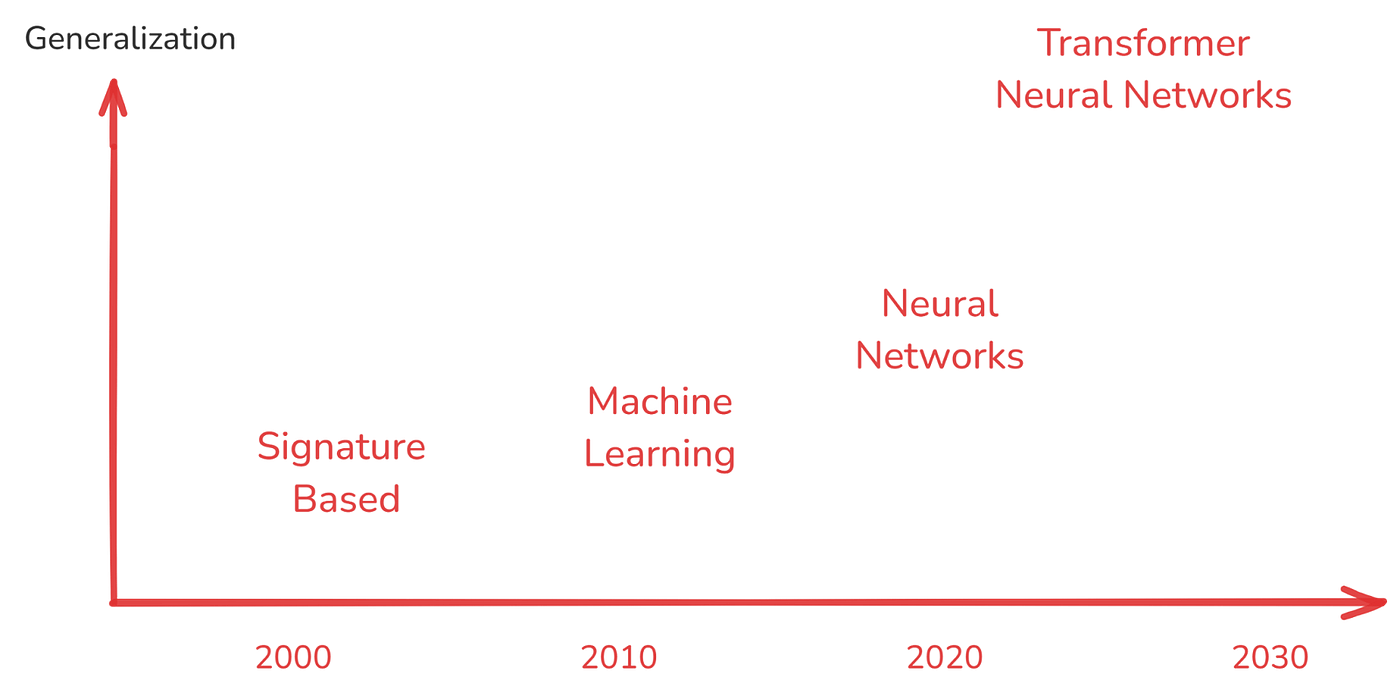As security models have evolved from signature‑based detection (basic generalization) to machine learning (improved but still narrow), to deep learning (better representation, but often siloed), to foundation models (wide-ranging, fast adaptation), the ability to generalize has steadily climbed: